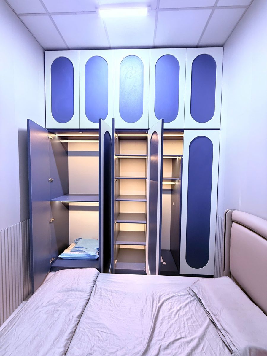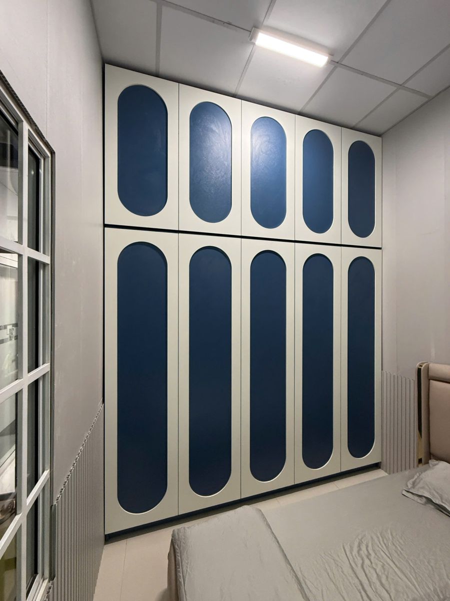 Không gian được thiết kế theo phong cách Modern Minimalist – hiện đại tối giản, tập trung vào đường nét gọn gàng và bố cục thông minh. Tông màu chủ đạo gồm trắng – xanh, giúp căn phòng trở nên sang trọng, ấm cúng và dễ chịu.