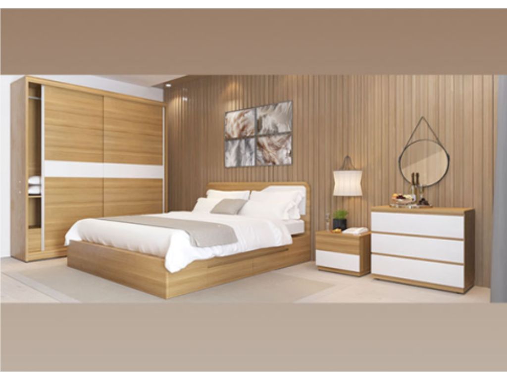 Giường phòng ngủ cao cấp gỗ công nghiệp Melamine kết hợp sơn PU. Giường có 02 ngăn kéo để đồ, nhằm tăng không gian sử dụng cho người dùng. (Một bộ bao gồm giường, tap đầu giường, tủ áo cánh lùa sử dụng ray cao cấp, bàn phấn.)